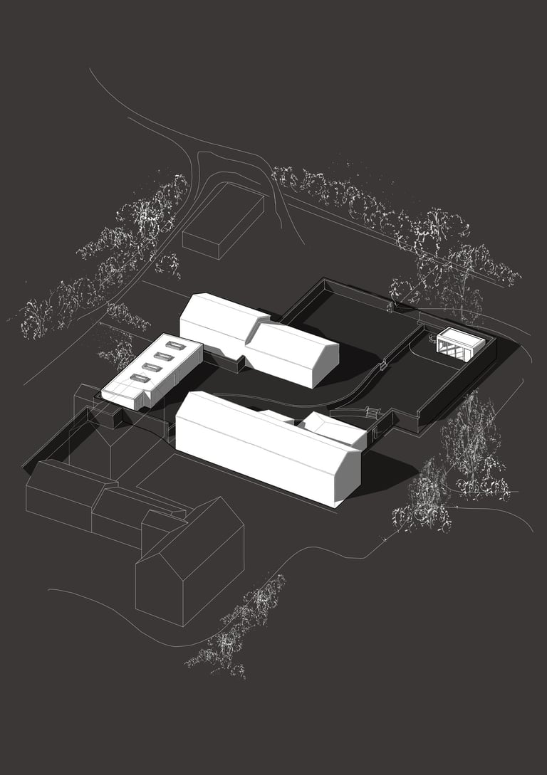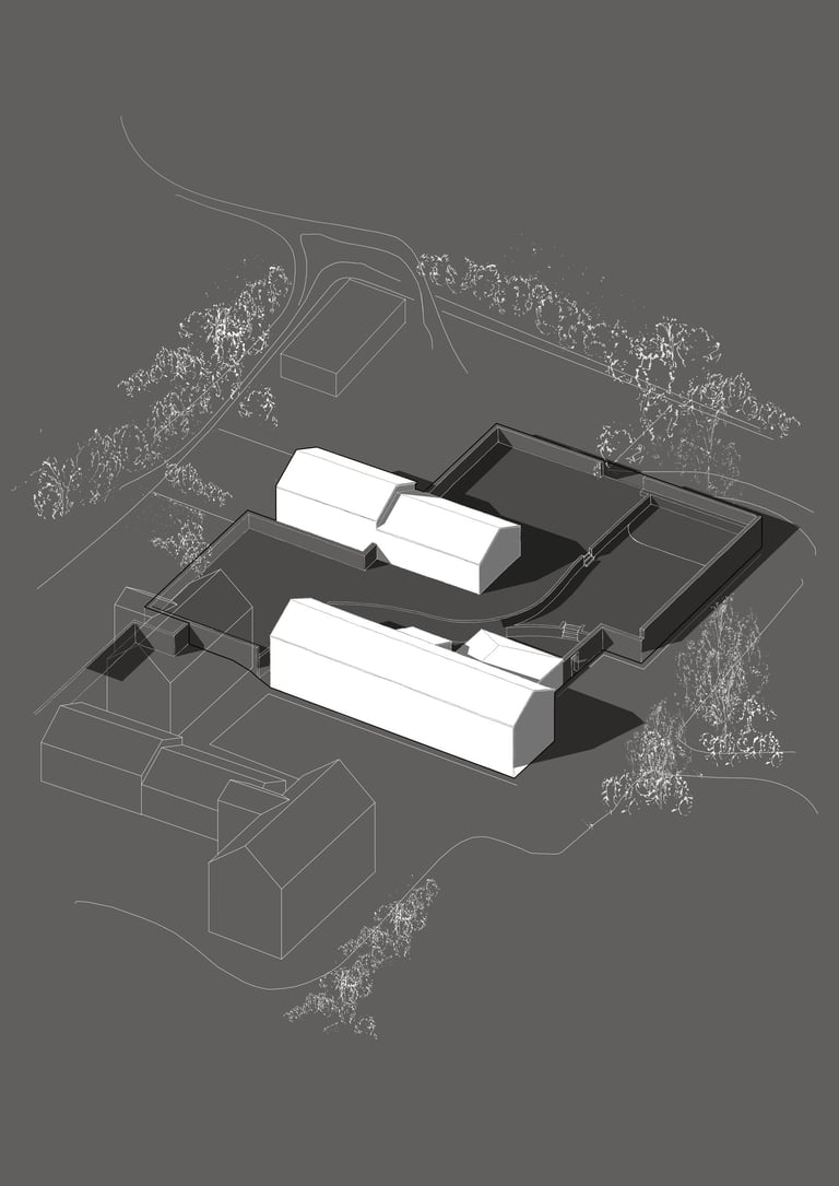 Sensitive additions to an existing farm cottage located in Green Belt land. The vernacular garden room and garages are designed in simplified monolithic form to be constructed using local stone from the surrounding farmstead.